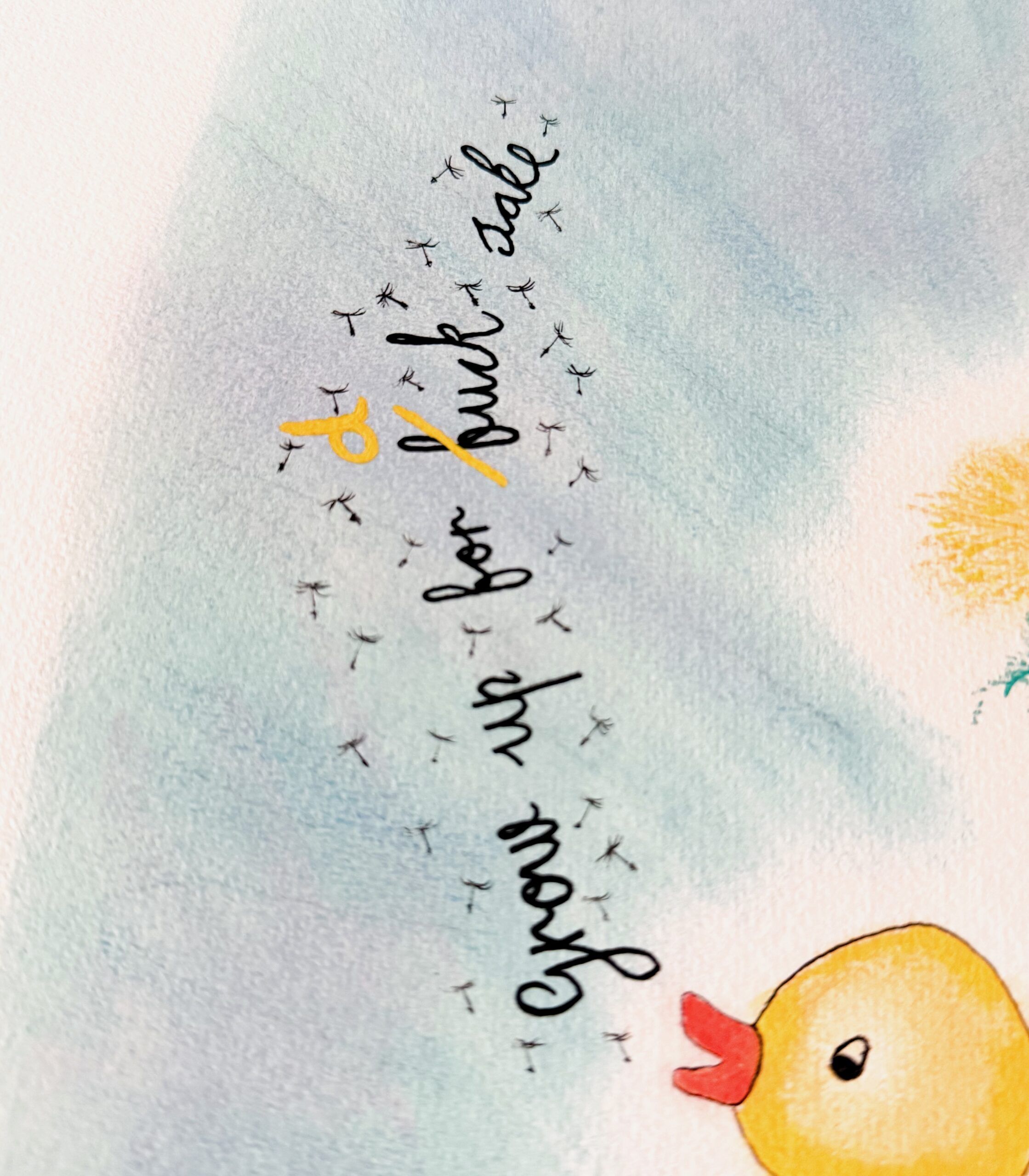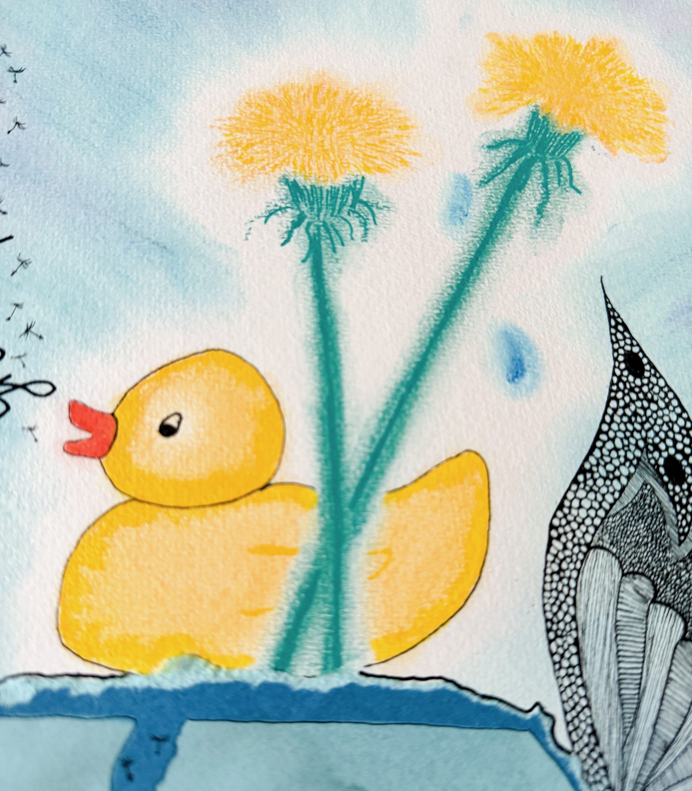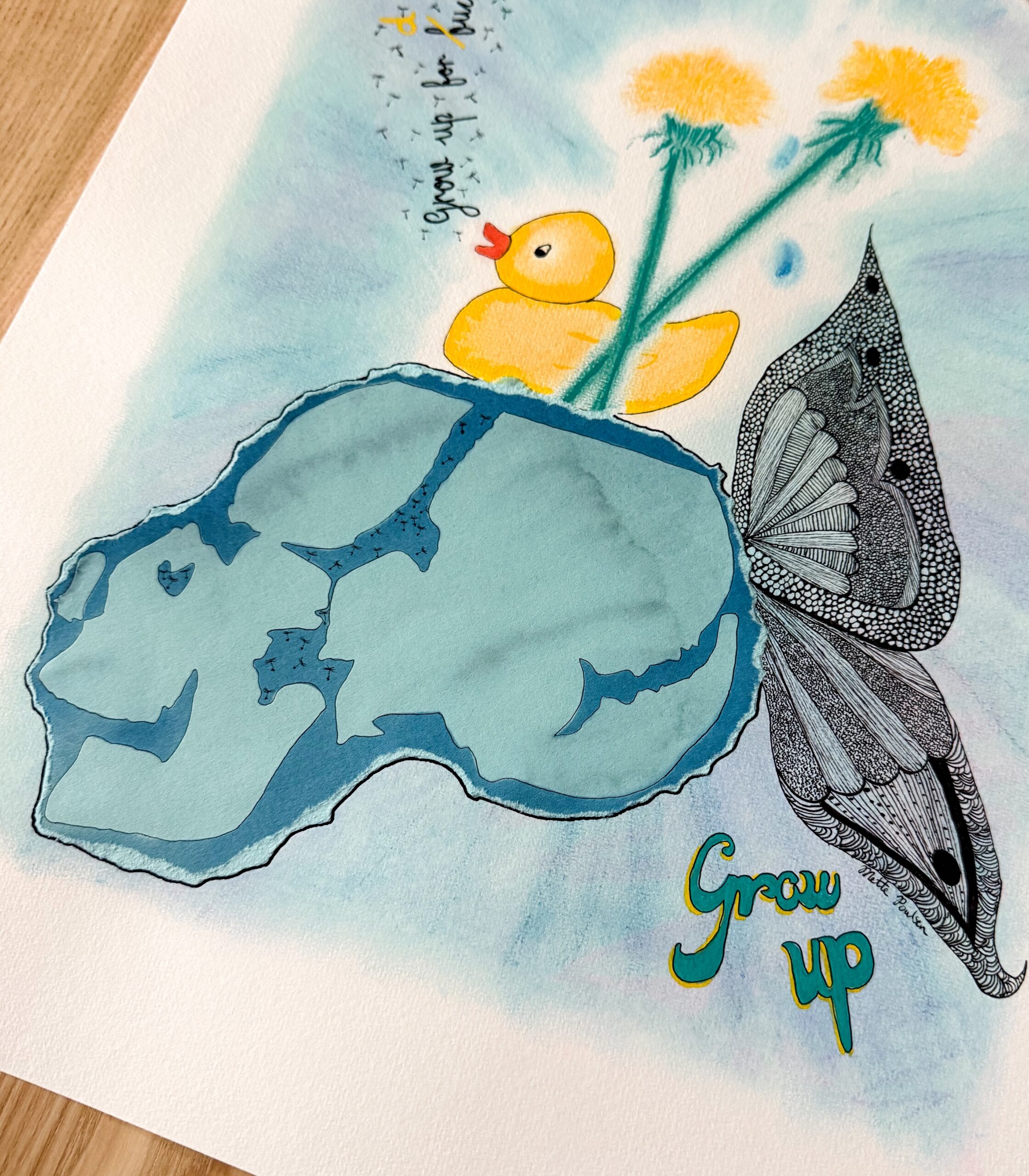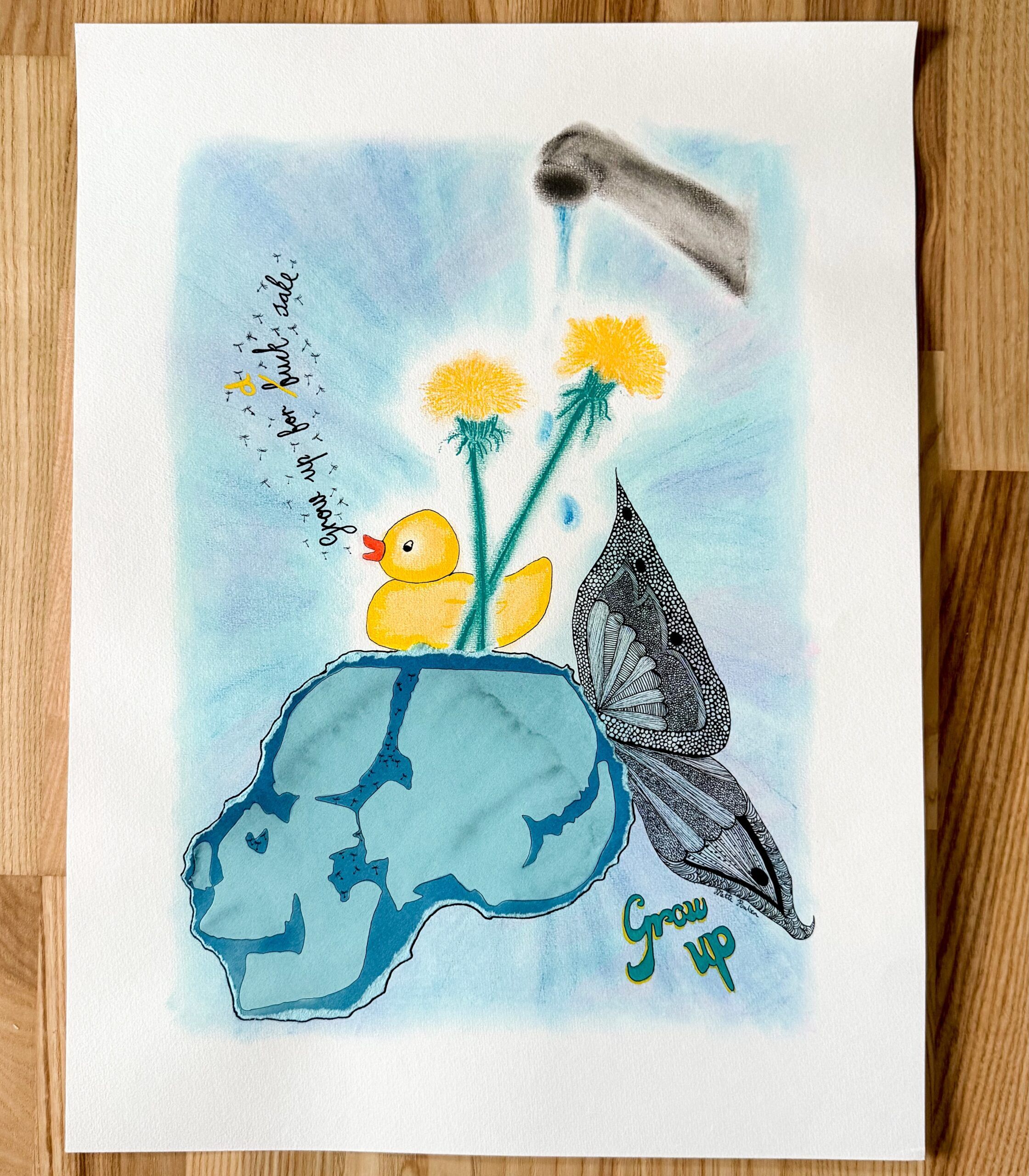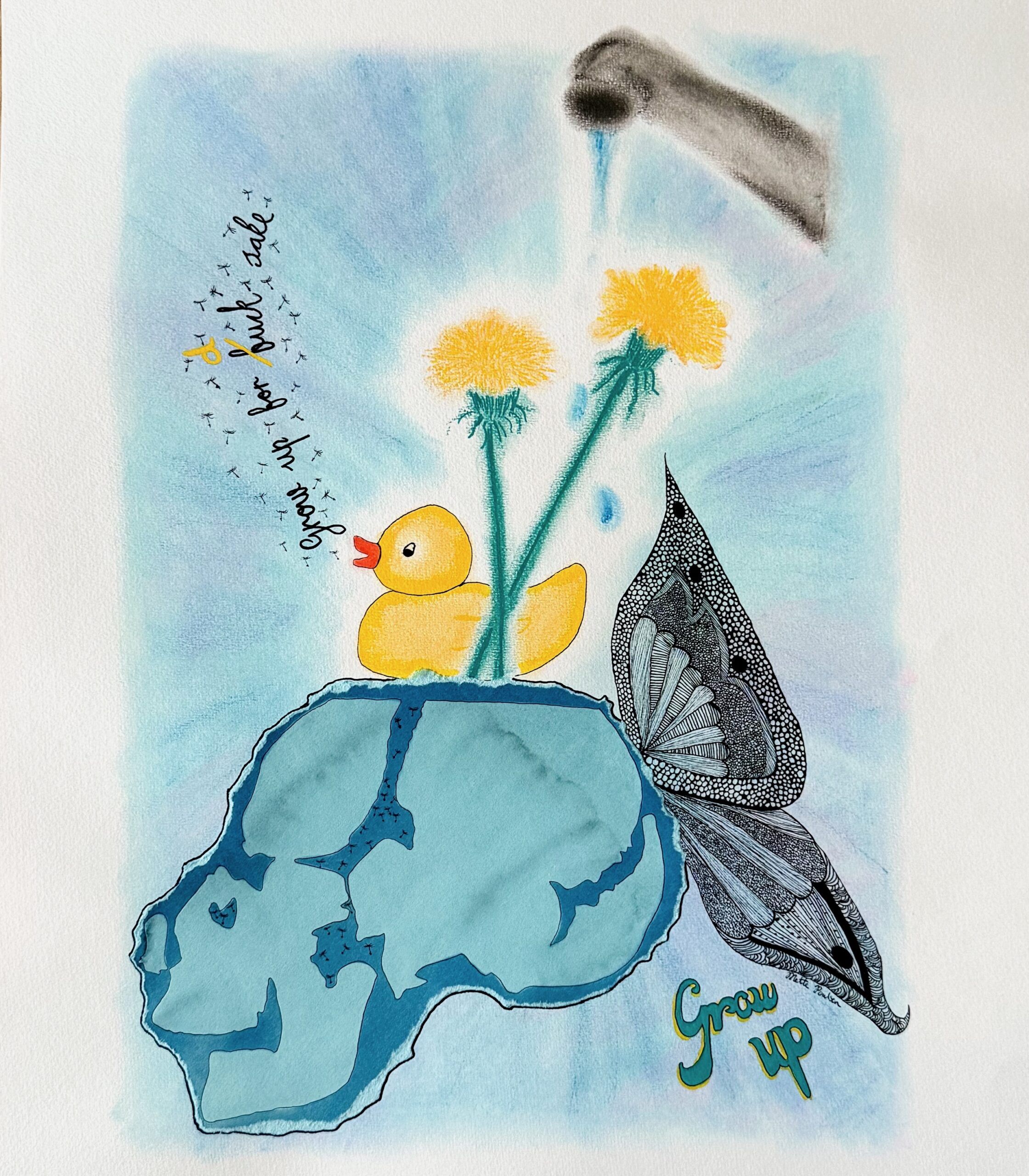‘Grow up’ er et tankevækkende kunstværk, der udfordrer dig til at se på de sider af dig selv, du måske skubber væk. Som en badeand, der altid flyder op til overfladen, finder det undertrykte vej tilbage. Værket symboliserer vækst, transformation og skyggearbejde – en påmindelse om, at sand udvikling sker, når du tør omfavne hele dig selv.