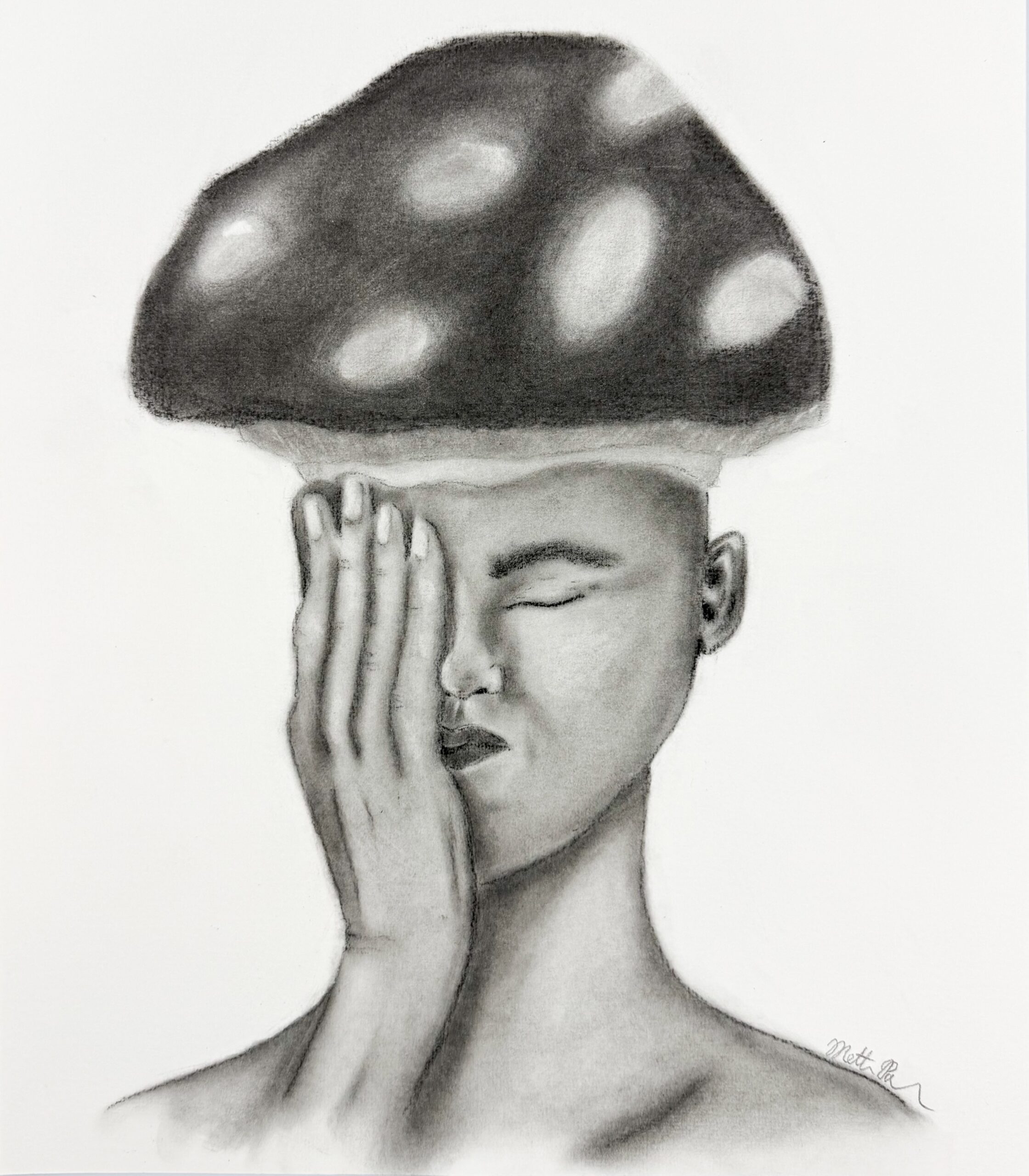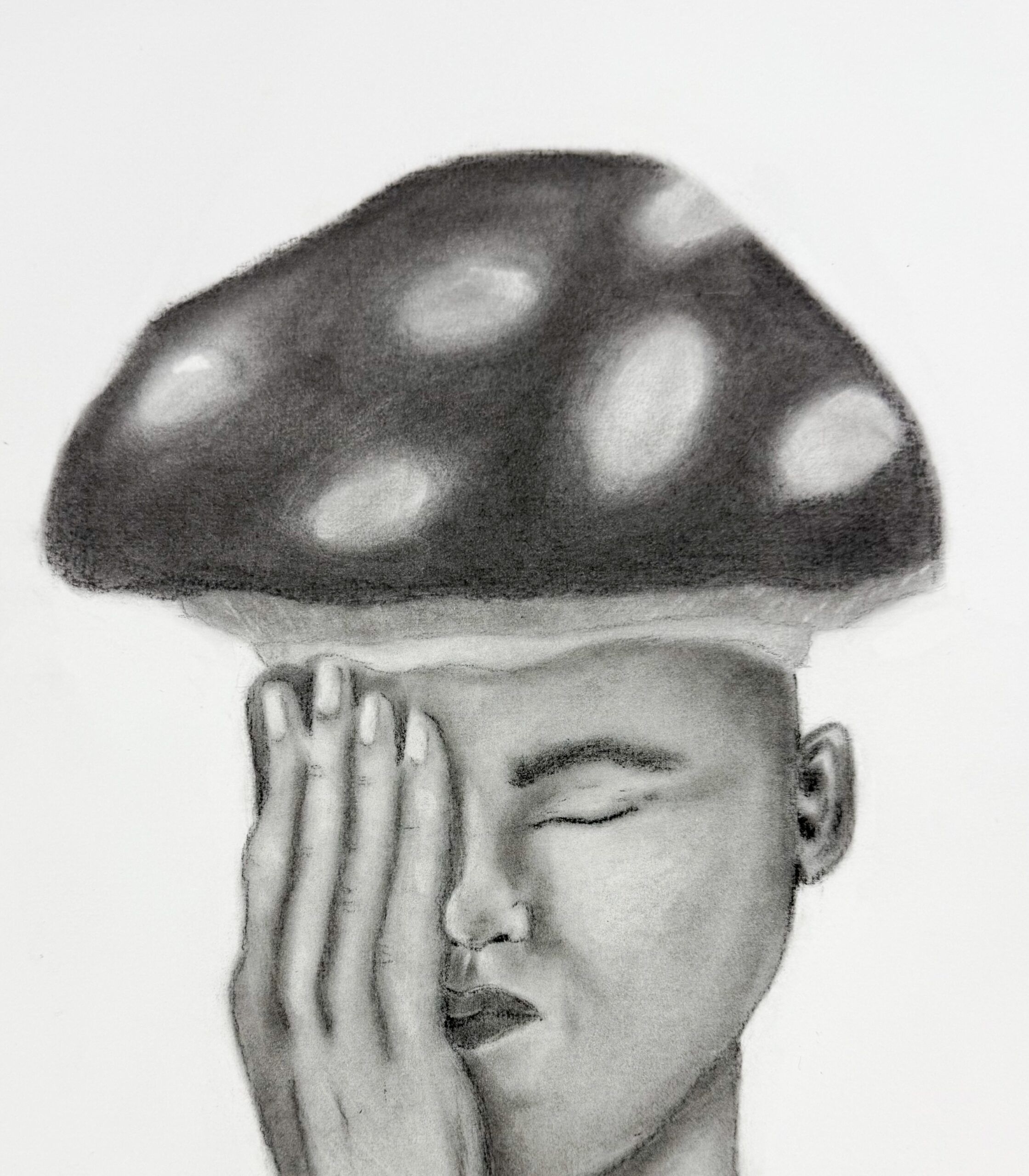 Med det ene øje skjult bag din hånd og det andet forsigtigt lukket, mærker du spændingen mellem smerte og evnen til at iagttage dig selv og dine tanker. De fine detaljer afslører kompleksiteten i at bære på indre kampe, mens svampen på dit hoved symboliserer følelsen af at være fanget i en tåget virkelighed.