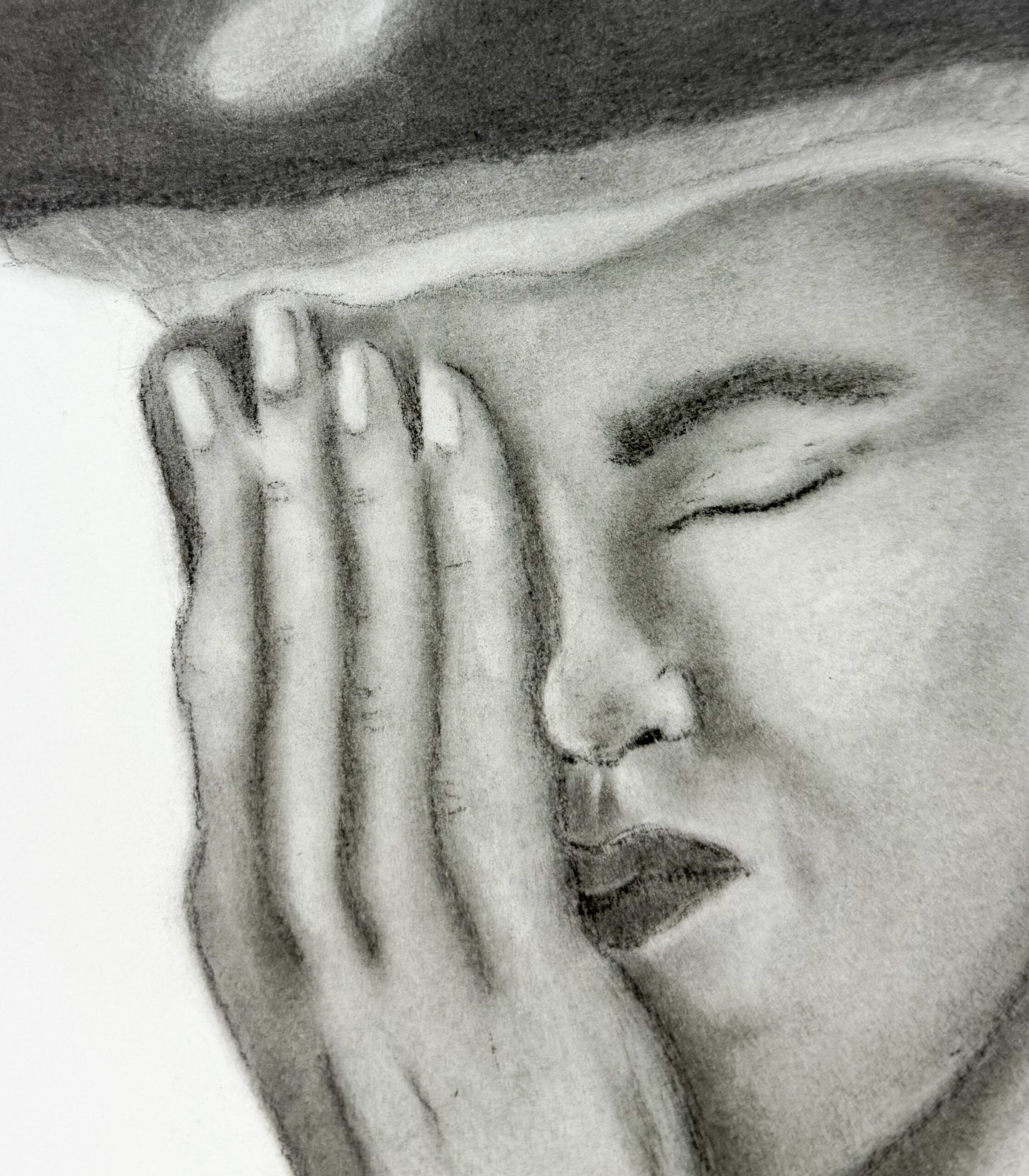 Denne kultegning skildrer spændingen mellem smerte og selvrefleksion. Den lukkede hånd og svampen symboliserer følelsen af at være fanget i en tåget virkelighed. Et kunstværk, der minder dig om forbindelsen mellem sind og krop – og vigtigheden af at lytte indad.